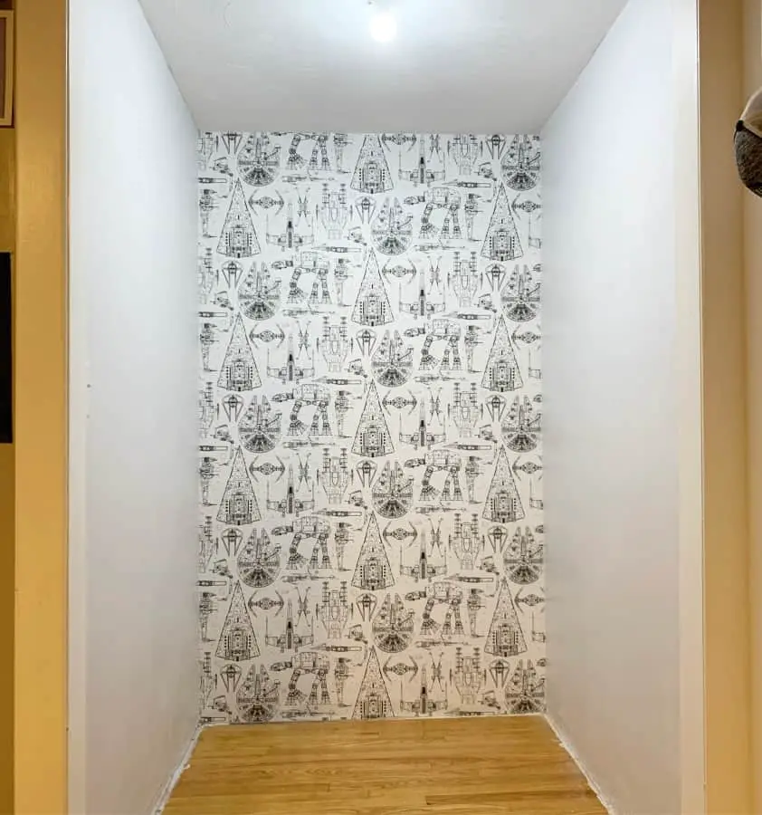 After pulling down the old wire shelving I painted the walls and added some fun peel and stick Star Wars wallpaper!