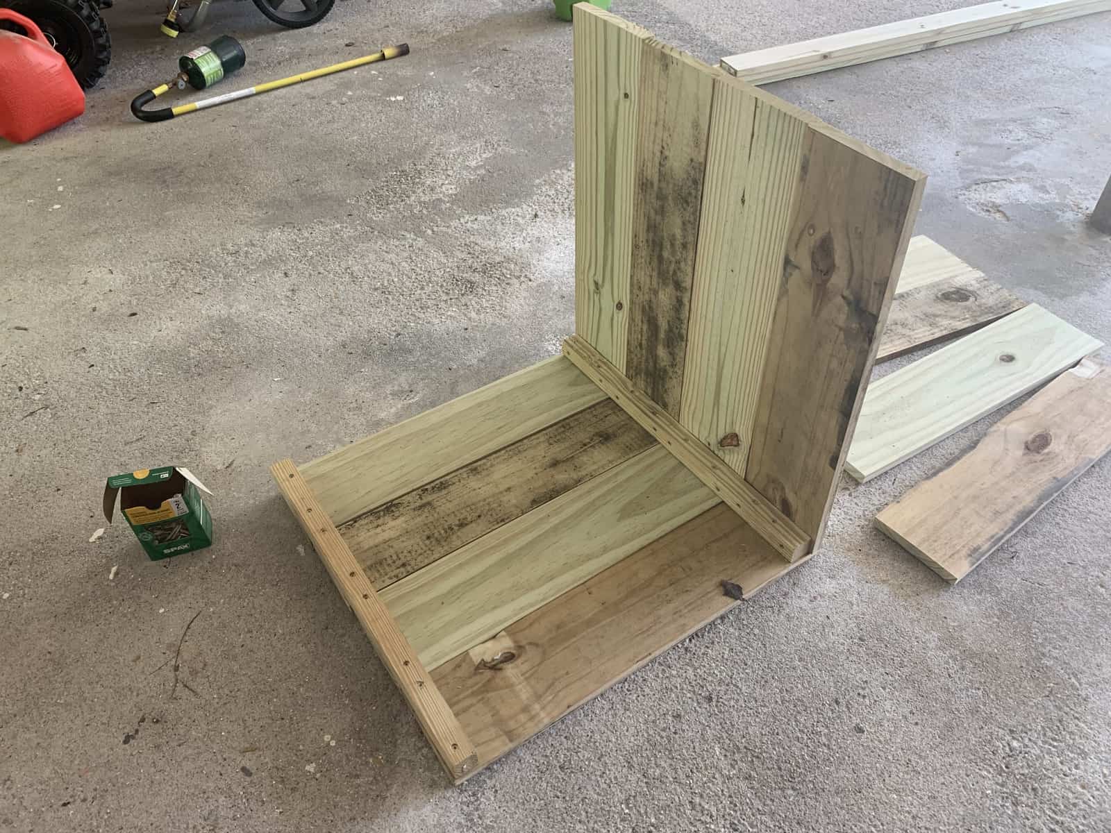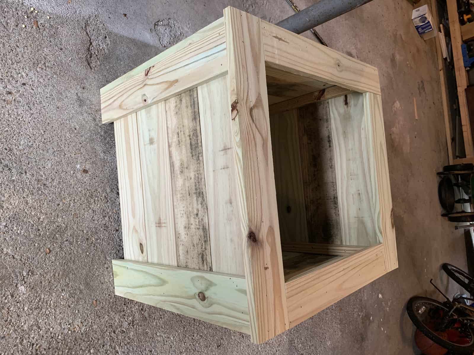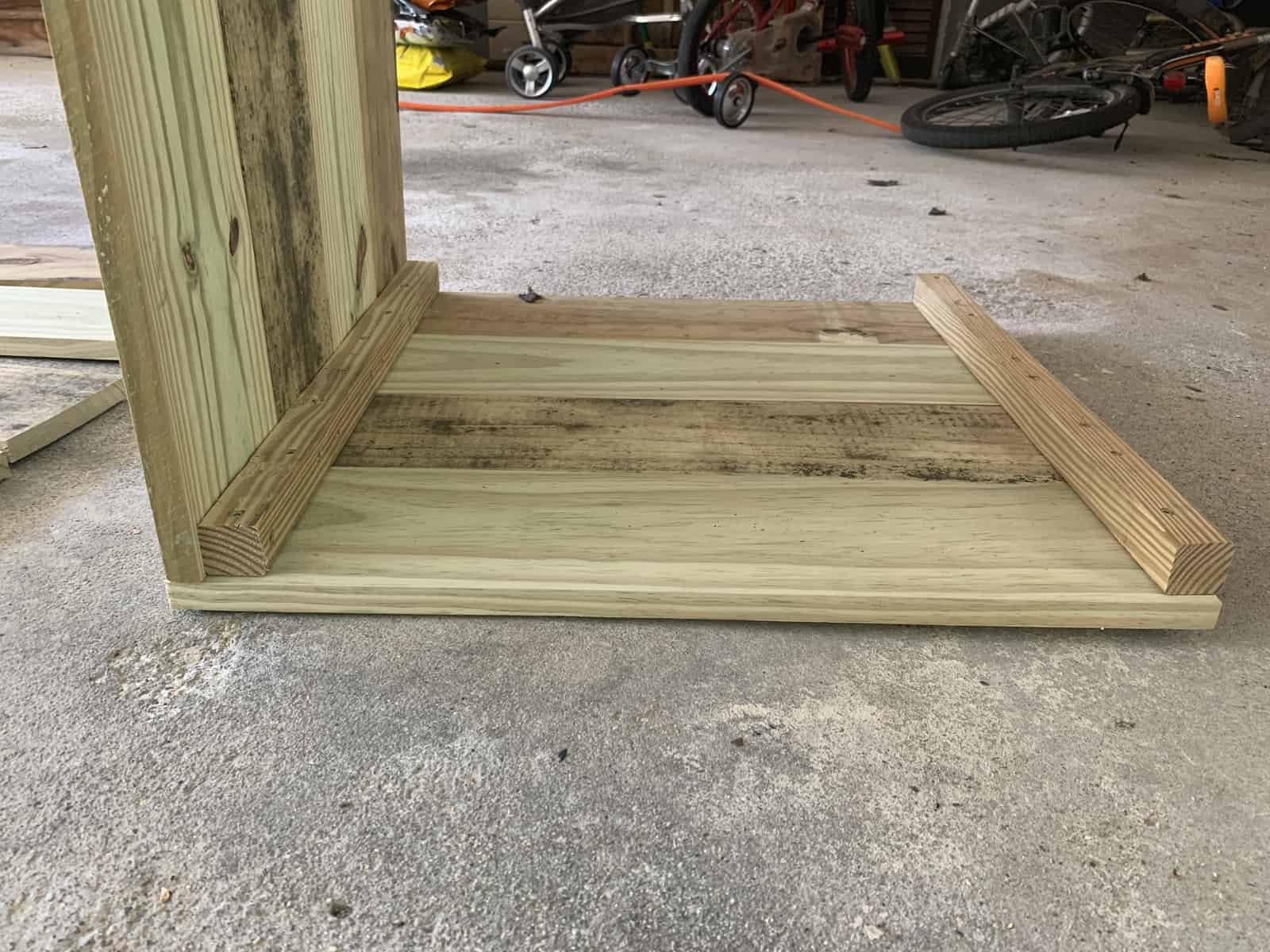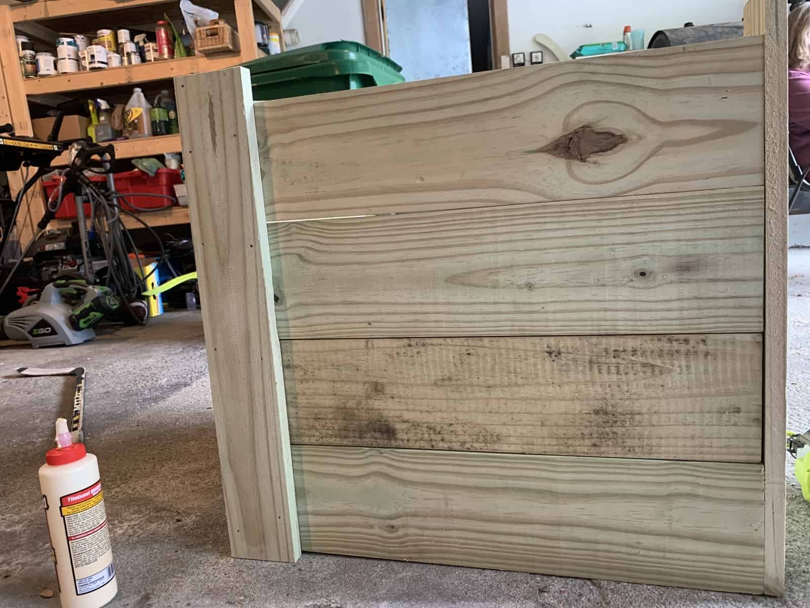 These boards were cut to 24 inches in length and create a little foot at the bottom. Again they overlap at the corners in a butt joint and you will want to arrange yours to make sure it looks good visually. I attached these with wood glue and 2 inch nails.