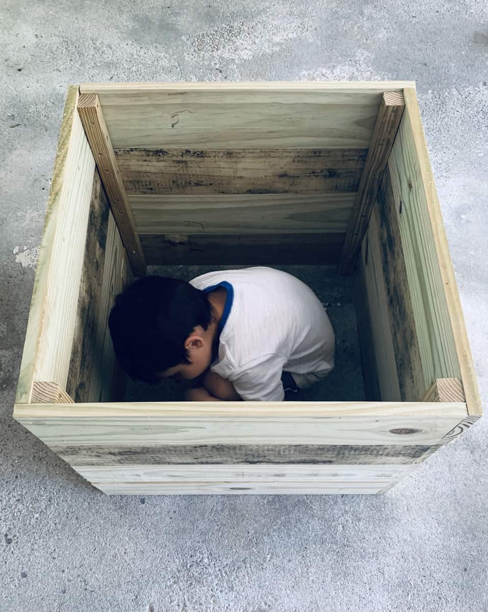 Fair warning, this large wooden planter uses a lot of soil! We added in several buckets of dirt, a whole big bag of potting soil, and some additional compost just to fill this baby up. You could easily make it a bit more shallow. Just raise up your side pieces and slats and you won’t have to use quite so much soil.