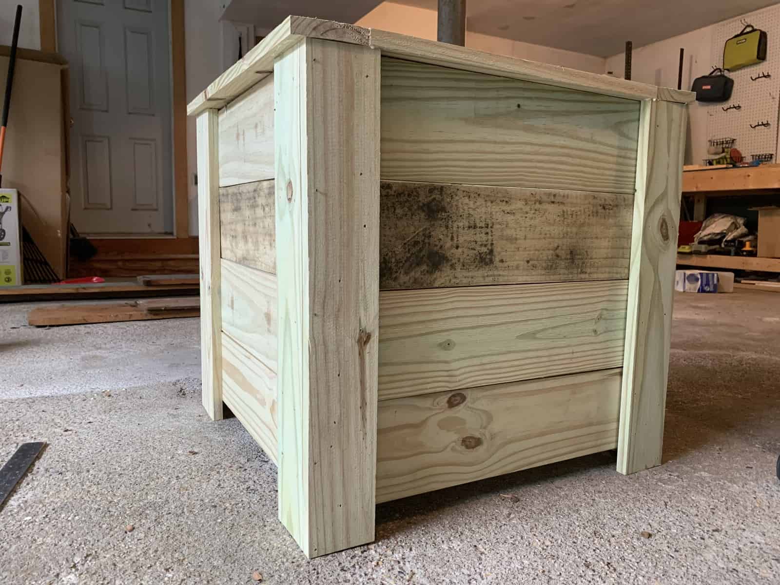 Once the box is assembled, it is ready for trim pieces to pull everything together! The smallest pressure treated boards that I could find were 1x4s. Originally I thought I would rip them down and make them smaller, but since my box is about 24 x 24″ around, it is pretty bulky and substantial. I decided to go ahead and use the 1x4s as is and really like the chunky appearance it creates.
