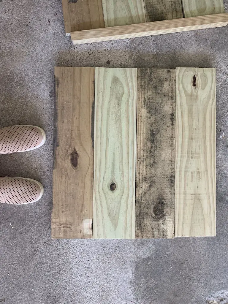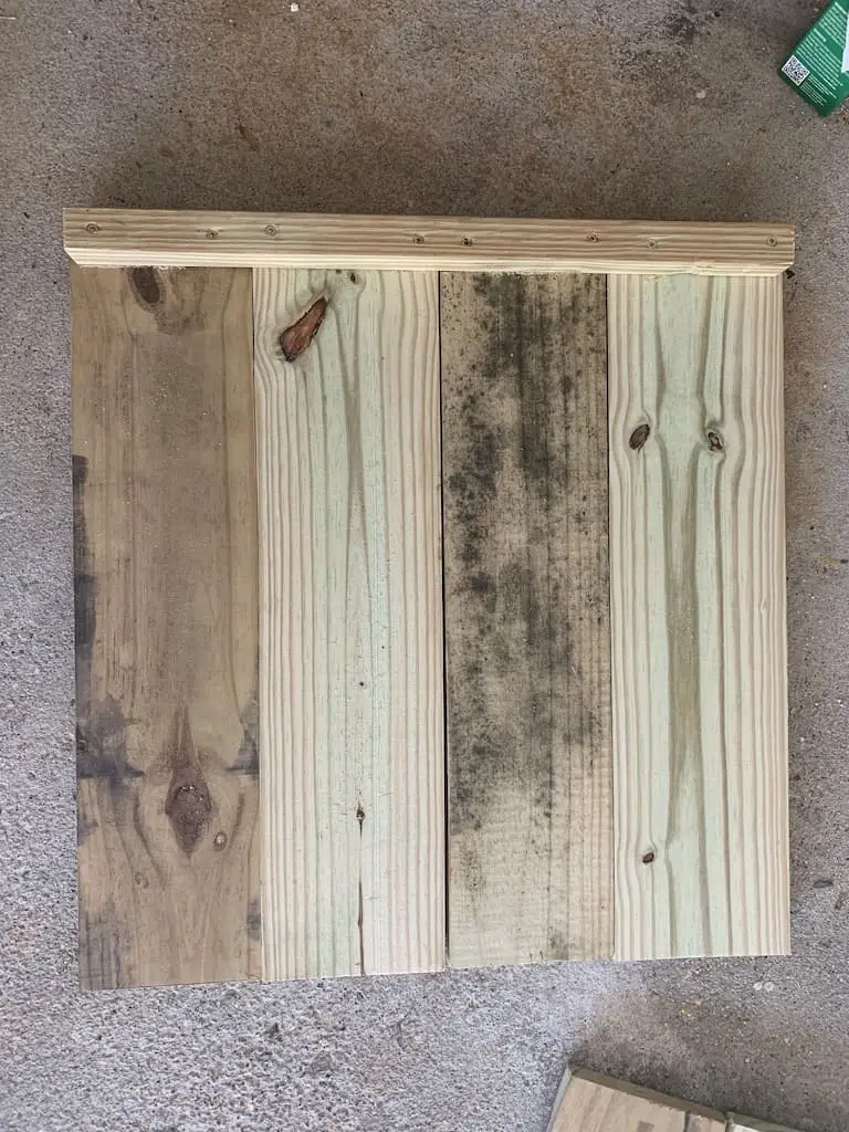 Once the side boards are cut, a 2 x 2 pressure-treated board was used to attach them together. This piece was cut to 22 inches, or just a little short of the height of the 4 horizontal boards. I lined the horizontal boards up together on the ground and put the 2×2 on top of it. This was then screwed into the horizontal boards from the backside using two 2″ spax screws per board.