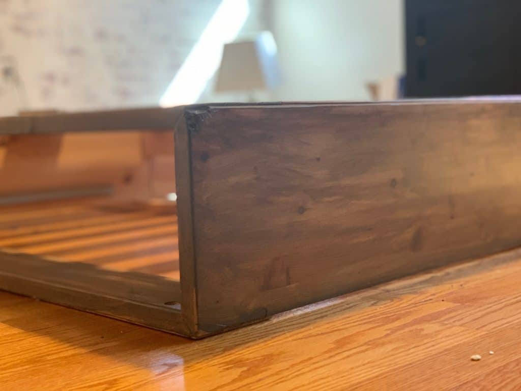 The bed base was sanded lightly and wiped free from dust. Then Varathane briar smoke stain was applied in two light coats and allowed to dry for several hours. And honestly, that is it! The new stain warmed up the color and made the platform base look more rustic, which fit much better with the rustic industrial vibe that I’m going for.