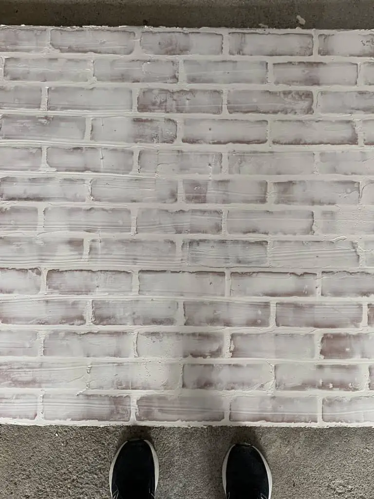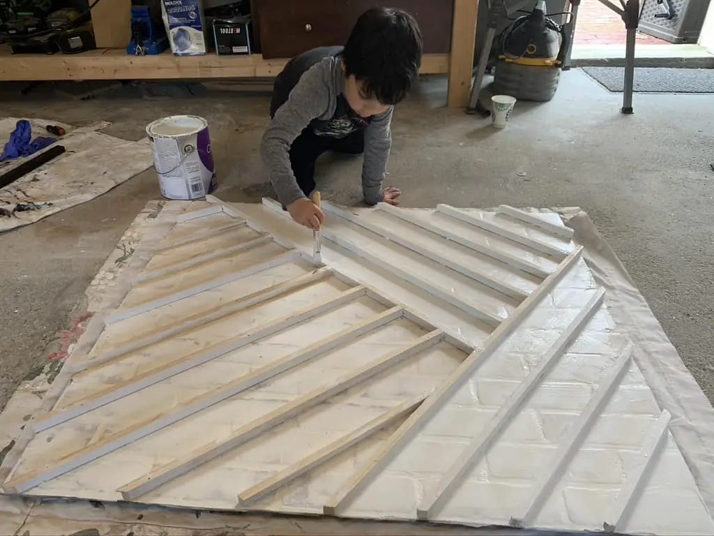 Given I was using a few stitched together pieces of paneling as my backing, there were a few gaps that needed filling. Using some leftover joint compound from my wood paneling update, I used a german schmere technique to not only fill the gaps but also modernize the look of the faux bricks.