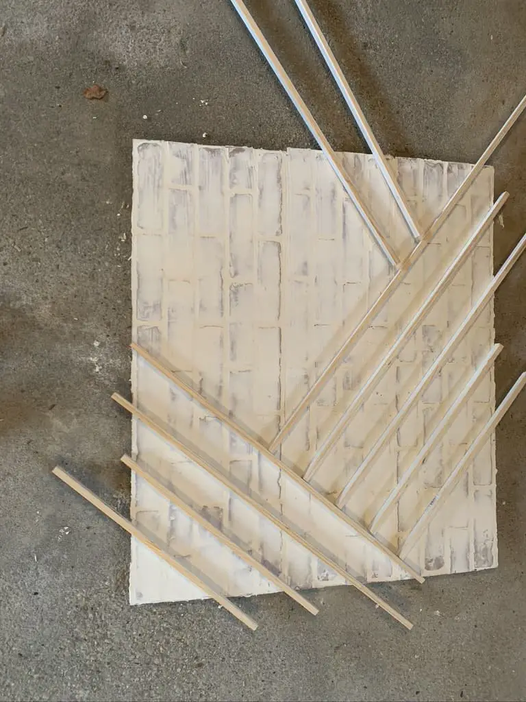 For the strips of wood, I used my table saw to rip down some leftover shiplap I had lying around. If you know me at all, you know that I really do not love using my table saw. But I do like to reuse and repurpose what I have so I made an exception here. That said, if you don’t have a table saw or don’t have scrap wood lying around, these square wooden dowels would be perfect for a project like this!
