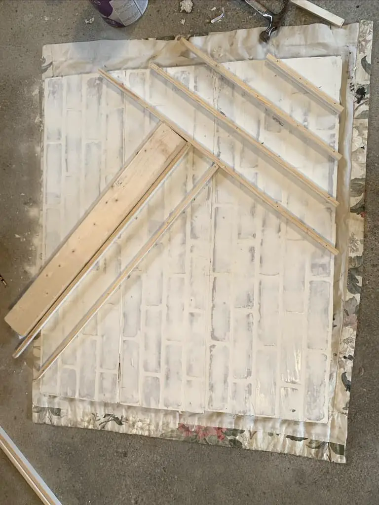 Now, in a perfect world, I would have had some scrap plywood lying around to use as the backing for this wall art. But, alas, I did not. I did, however, have some faux brick paneling leftover from One Room Challenge Industrial Sports Bedroom last year! It needed to be pieced together a bit but I was able to make it work. 3 strips of paneling were pieced together by adding strips of wood to the back in multiple locations. This not only secures them to each other but also provides some stability. Not pretty but functional.