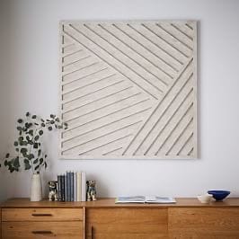 I used my West Elm inspo piece (pic below) to help me decide on the layout of where to place my wooden strips. A 2×4 scrap piece of wood was used to make sure the spacing was consistent in between strips. You could literally do any design here that you want! Once the strips were in place, add glue to the back and then secure them with a nail gun. As you can see, the strips aren’t perfect on the edges here…and they don’t need to be. Once it is all secured, take a circular saw or jigsaw and cut off the excess.