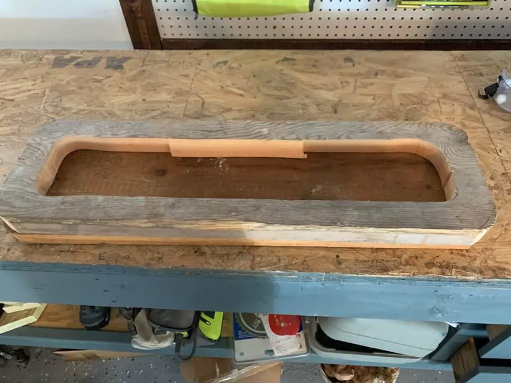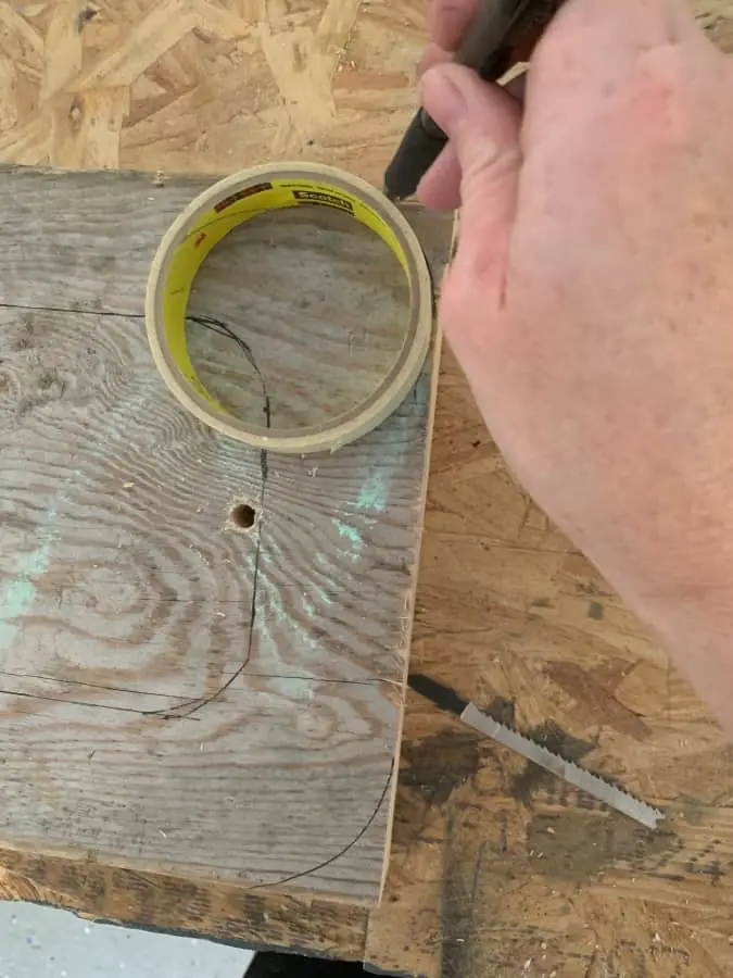 Take your jigsaw and cut along your outline until you have the oval or circle cut out of the middle of your top board. I also rounded my outer edges here which is optional.