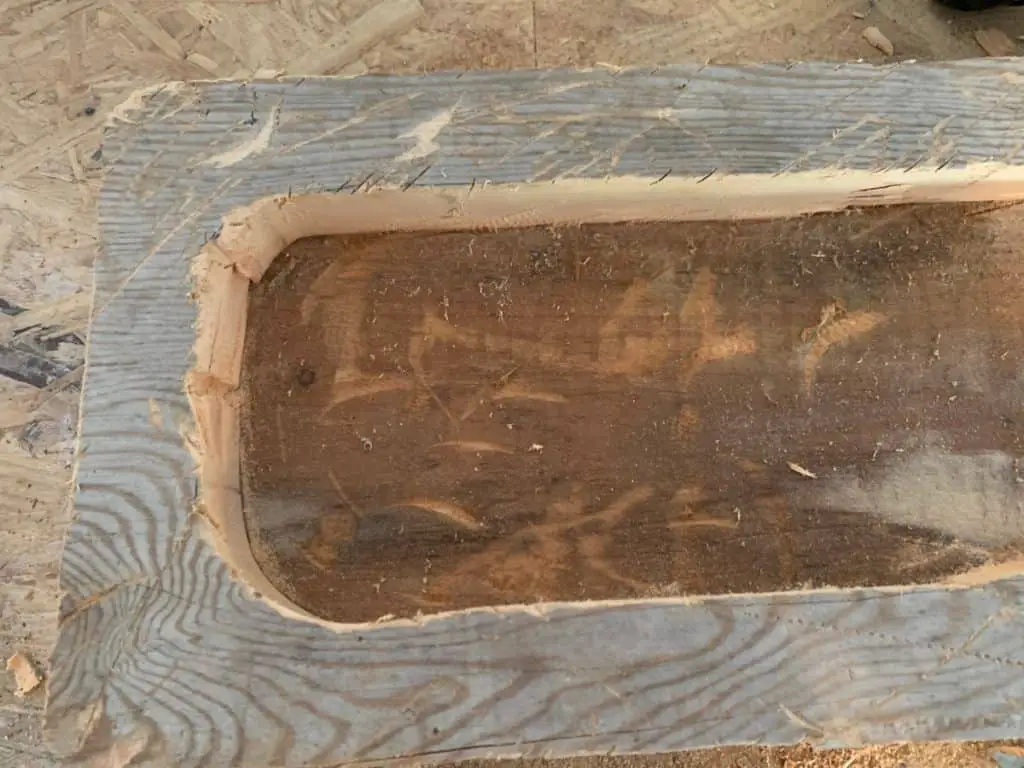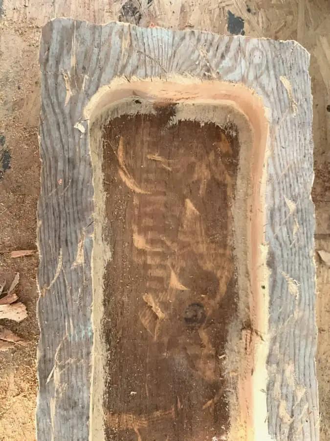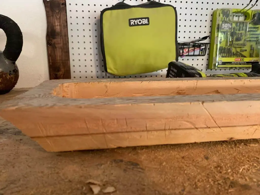 Use whatever tools you have on hand to create a weathered vintage hand carved look to your bowl. I used my Ryobi multi tool here to take out some chunks and add some cuts and character. You don’t want super straight edges here so make sure to soften those up by removing bits of wood here and there. Have some fun with it!