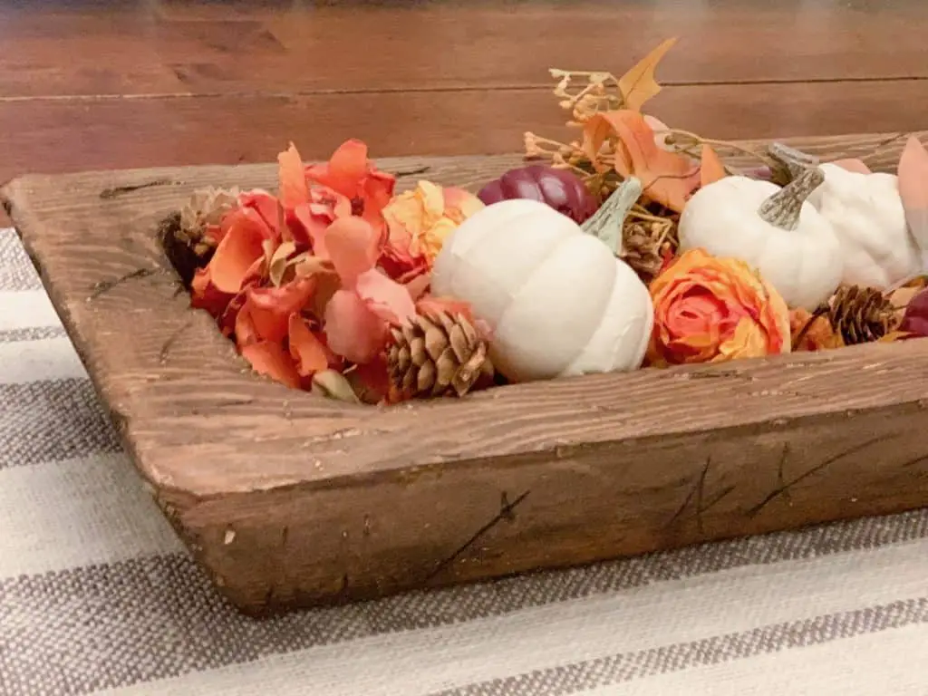 Fill your new gorgeous DIY large wooden dough bowl with any type of decor you like! It’s fall here and I wanted mine on the dining table so I added some fall florals along with some cute pumpkins.
