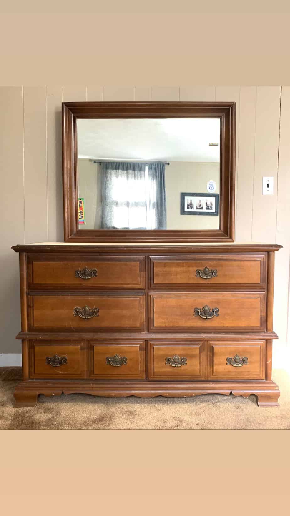 This dresser was found on Facebook marketplace and it was a steal! I scored it for $20. No lie. It really was just too good to pass up! And it was really amazing because I had been on the lookout for a dresser with a mirror for my guest room for several months. When this popped up not too far away, I knew I had to have it.