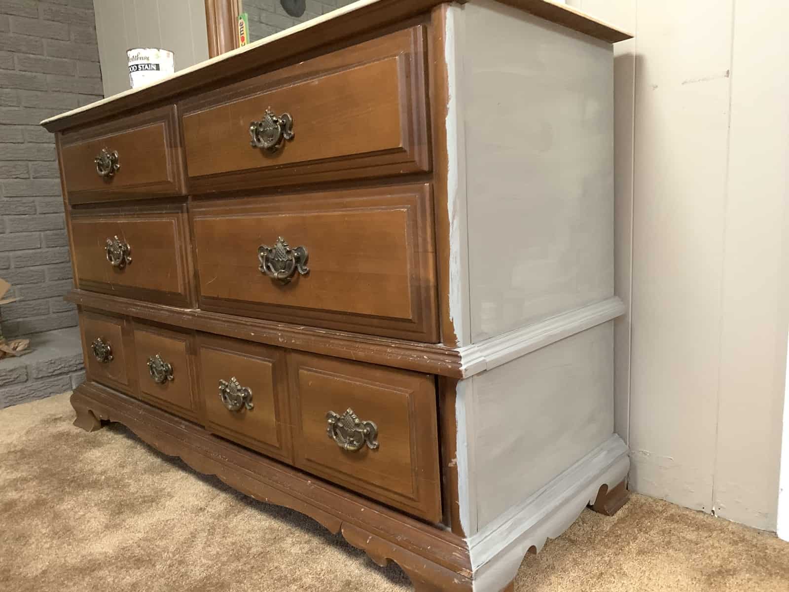 I did not, however, want to deal with stripping or sanding the bottom half of the dresser or the mirror. The plan for those pieces was to paint with chalk paint. So the bottom half of the dresser was cleaned and the drawer fronts were given a very light sanding with a sanding block (actually my 4 year old did this part, that is how seriously I took it). Otherwise, I did absolutely zero prep for the bottom half of the piece.