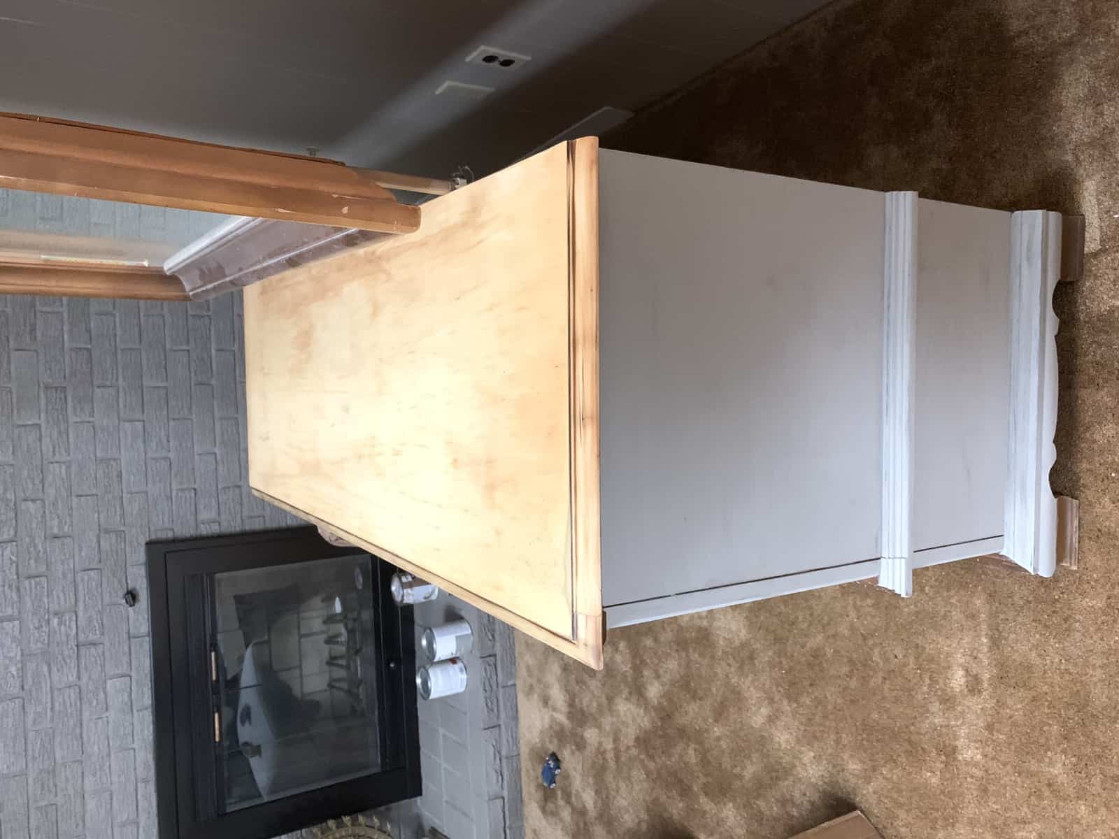 Once I got it home, I pretty immediately went to work! The top was a little beat up so I went to it with my belt sander and then followed up with my orbital sander. The goal was to remove as much of the old stain as possible so that I could re-stain the top.