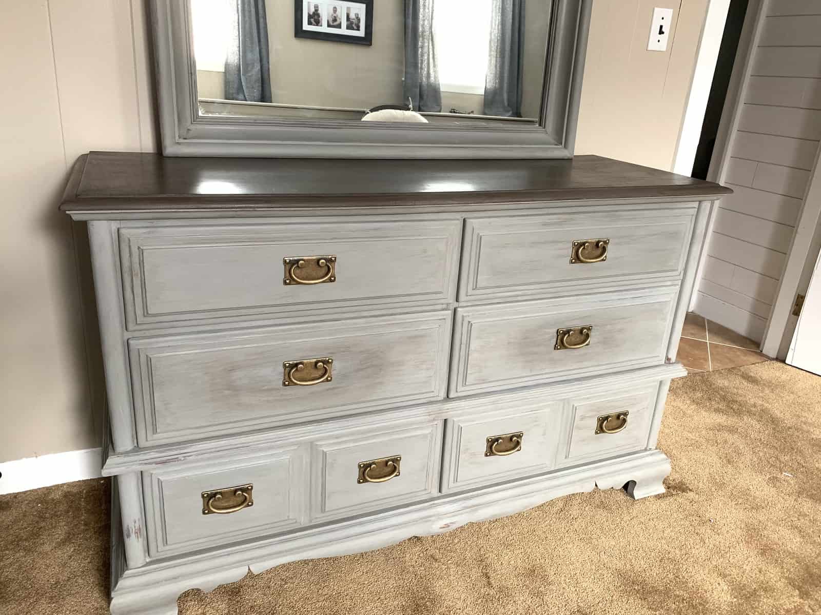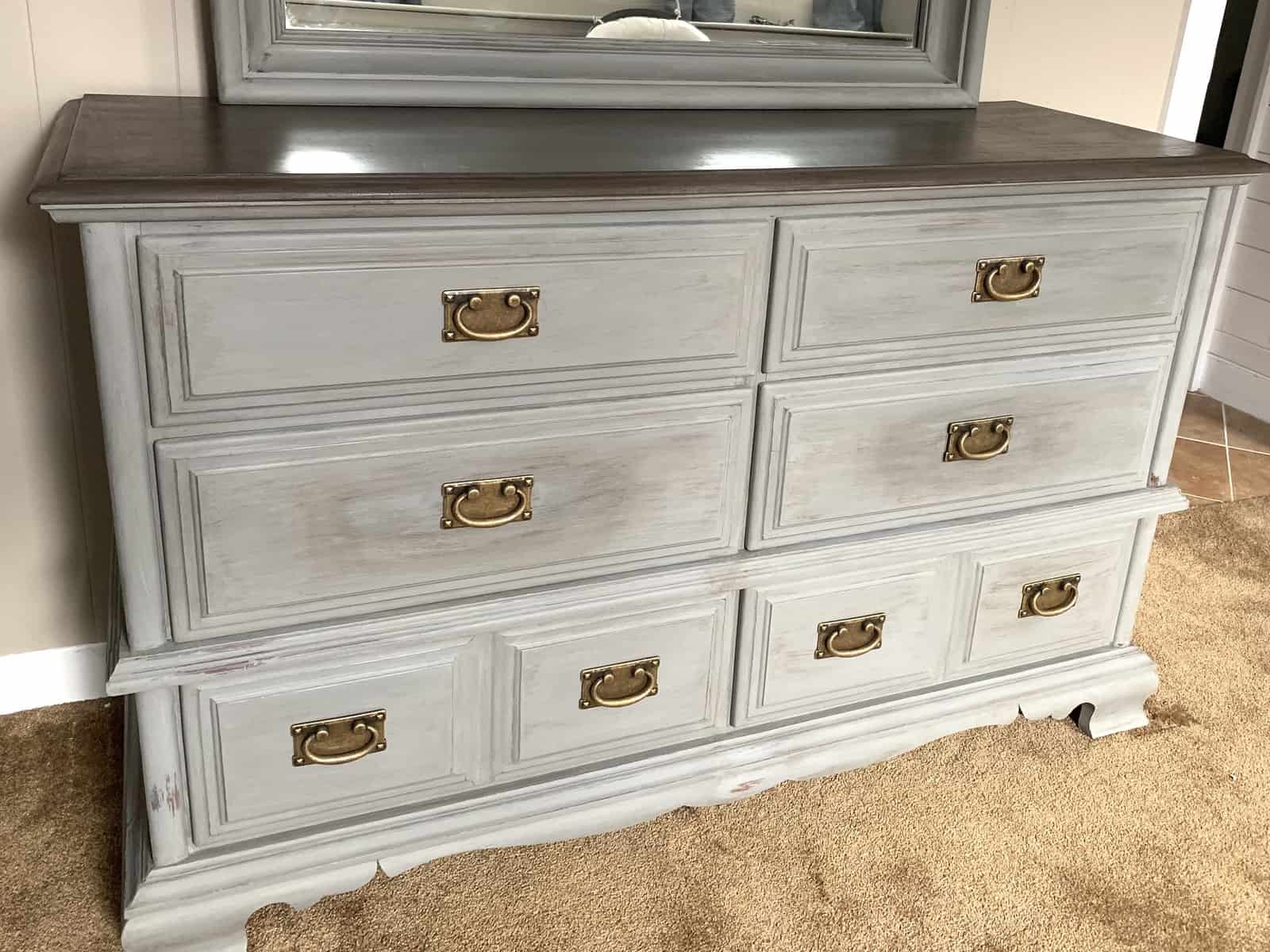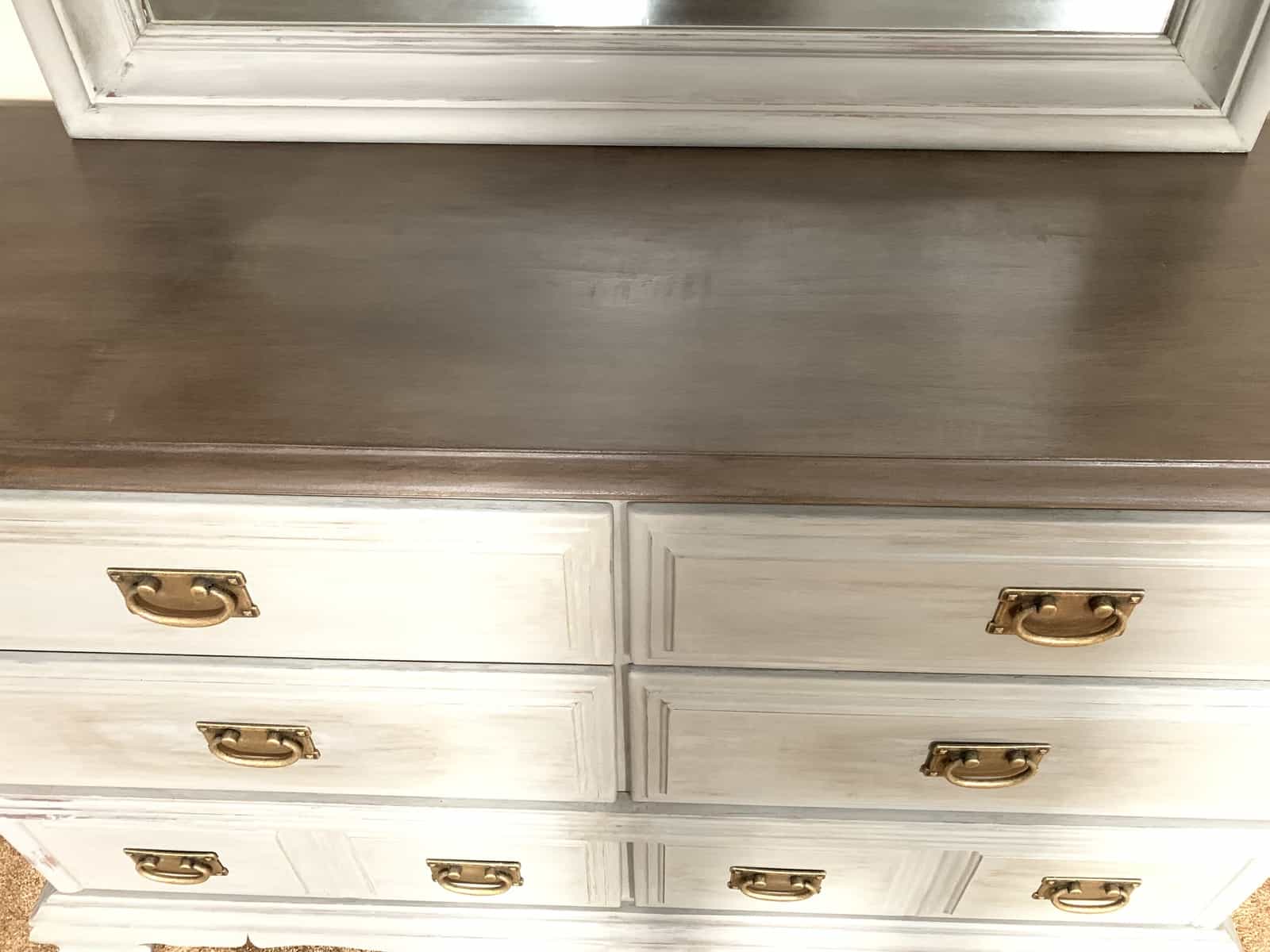 Chalk paint was used to paint both the mirror frame and the bottom half of the dresser and drawer fronts. You can find more tips on how to apply chalk paint in a previous post I wrote about updating furniture with chalk paint and gel stain!