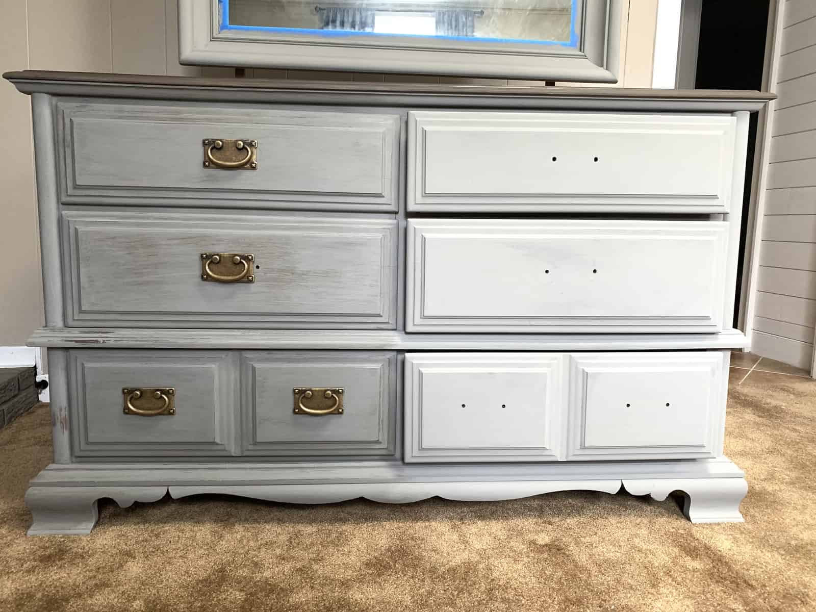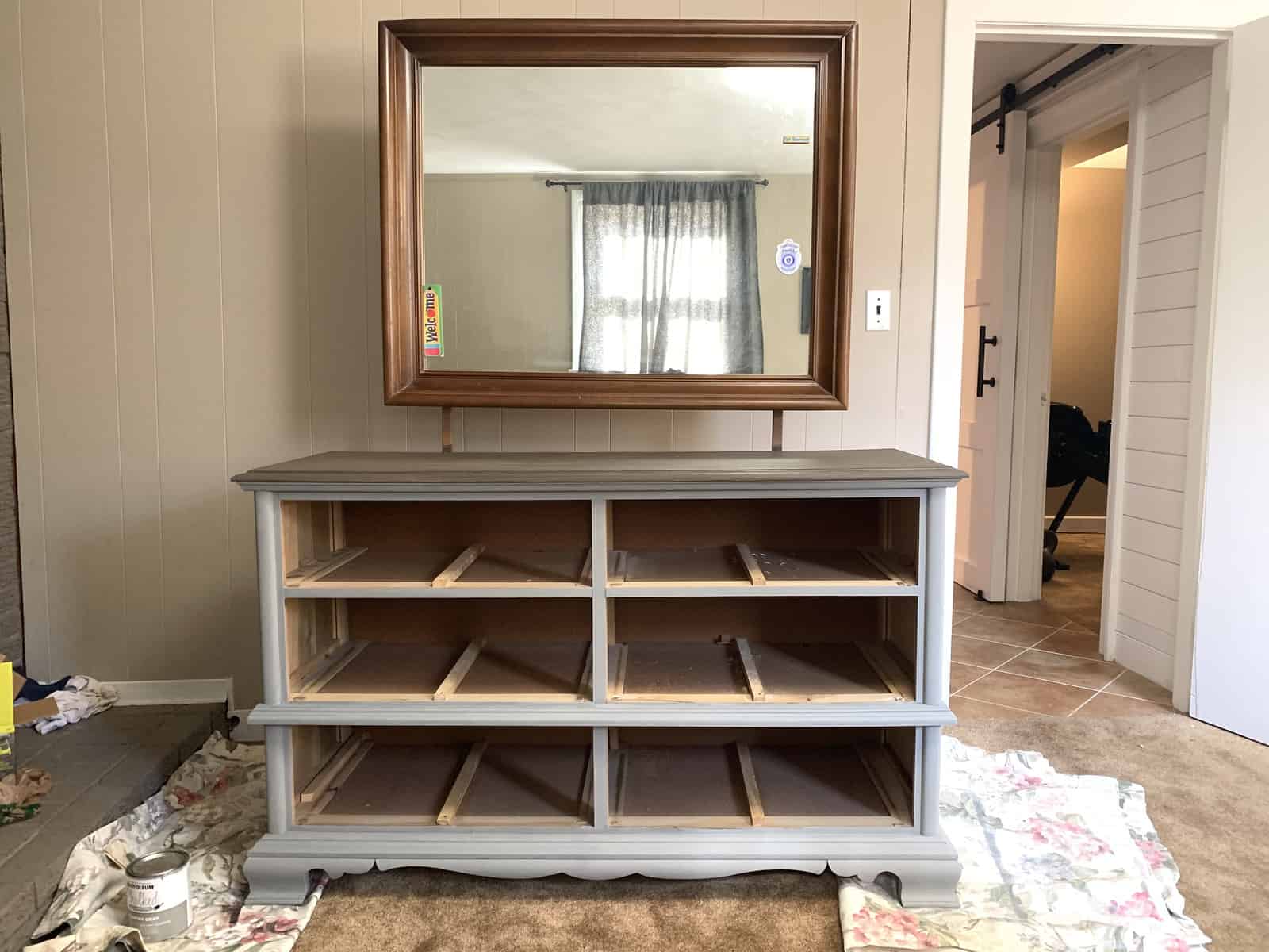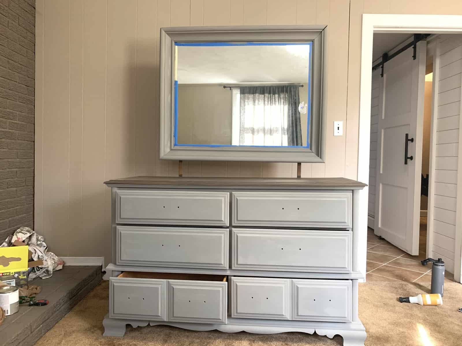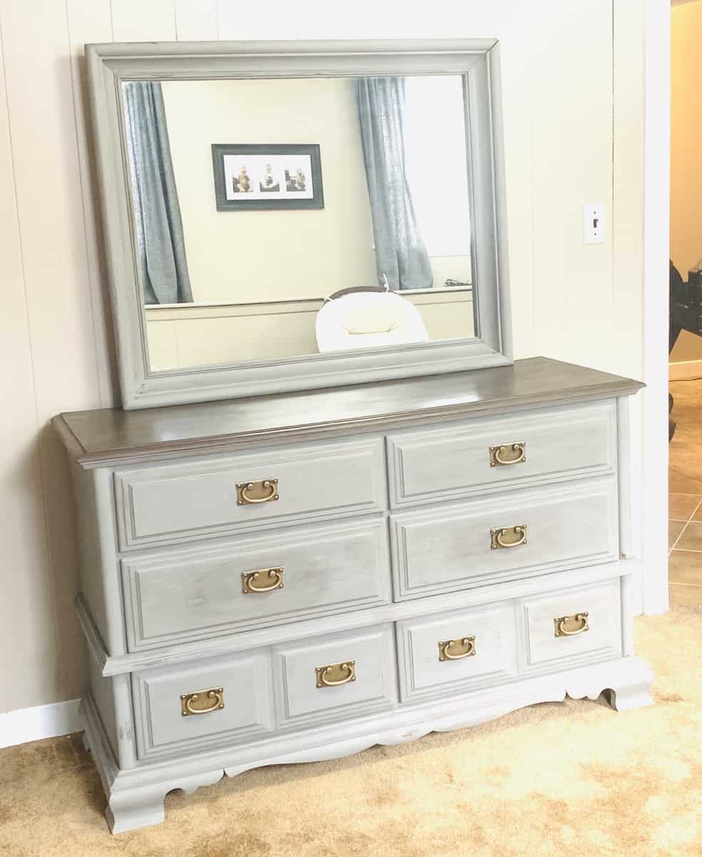 Chalk paint was used to paint both the mirror frame and the bottom half of the dresser and drawer fronts. You can find more tips on how to apply chalk paint in a previous post I wrote about updating furniture with chalk paint and gel stain!