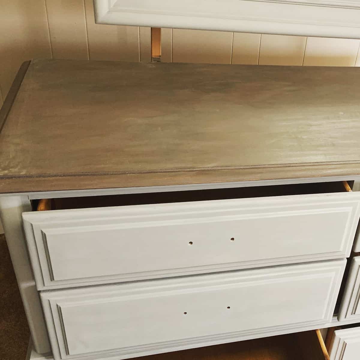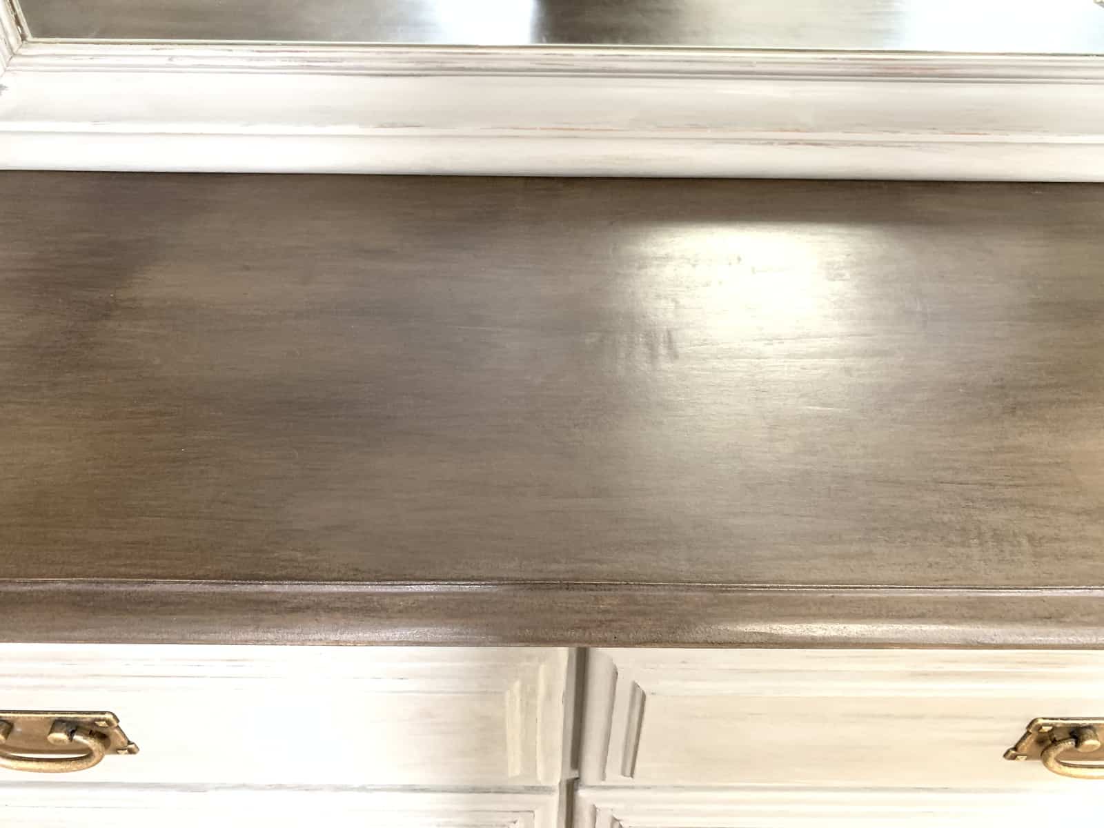 For the dresser top I used Varathane Briarsmoke stain. However, once this was complete I also felt that it looked a little too light and a little too flat. I added a couple coats of the dark wax to this as well which deepened the finish giving a richer color. Again, the wax is a bit difficult to work with so the finish isn’t perfectly uniform. But I do really love how it make the color look so much richer!