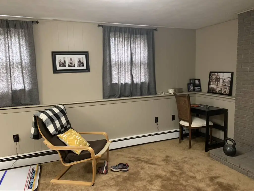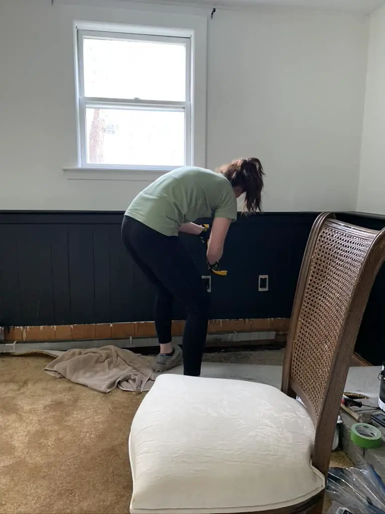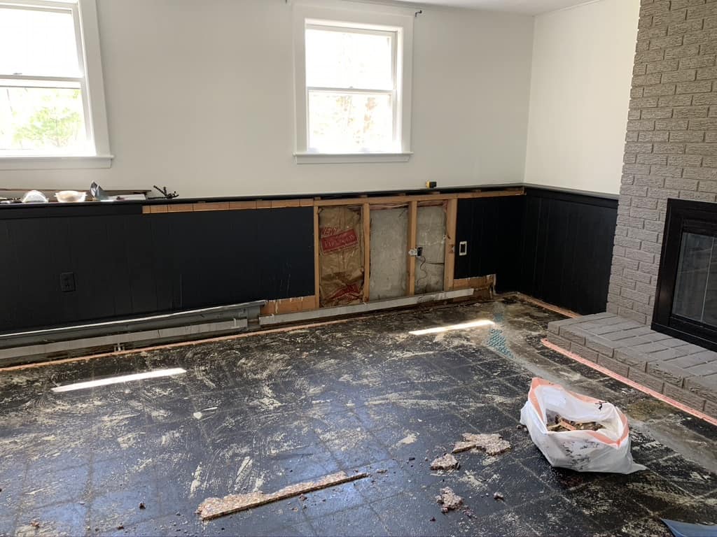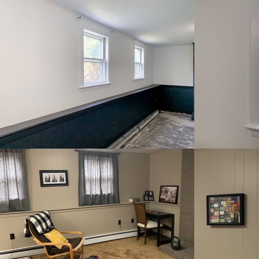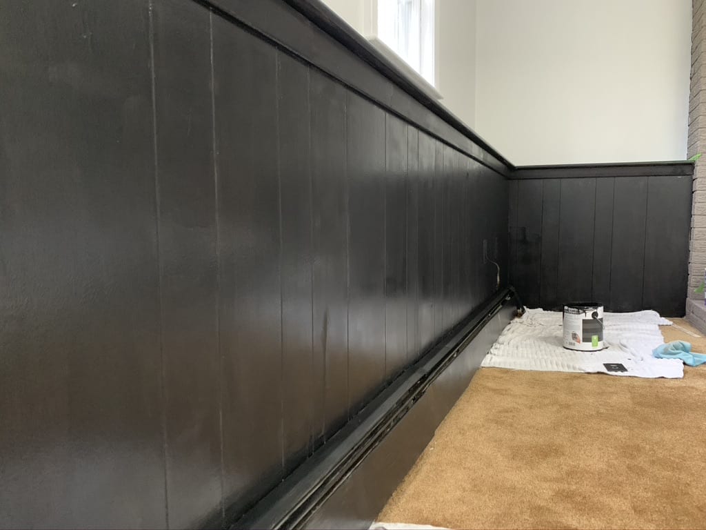 From a design standpoint, I initially decided to keep my bottom half wall as wood paneling and painted that black using paint I ordered from Amazon. But, spoiler alert, as I was working in the space I realized that the basement was getting water during times of rain. We brought someone in to take a look and they found a foundation crack that required that I disassemble the newly painted black wall. Sad. The positive? It gave me a good excuse to rip out the carpeting and update the flooring.