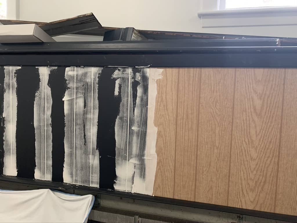 Cost: Joint compound runs about $10-20, paint varies significantly- I used 1 gallon of Sherwin Williams Pure White for $28 and then also got a Gallon of black paint from amazon. All told I probably spent about $50 on paint (my joint compound was free from a friend). You might also need painting supplies if you don’t have those things. I used this cool paint roller that holds paint in the handle and it really sped things up!